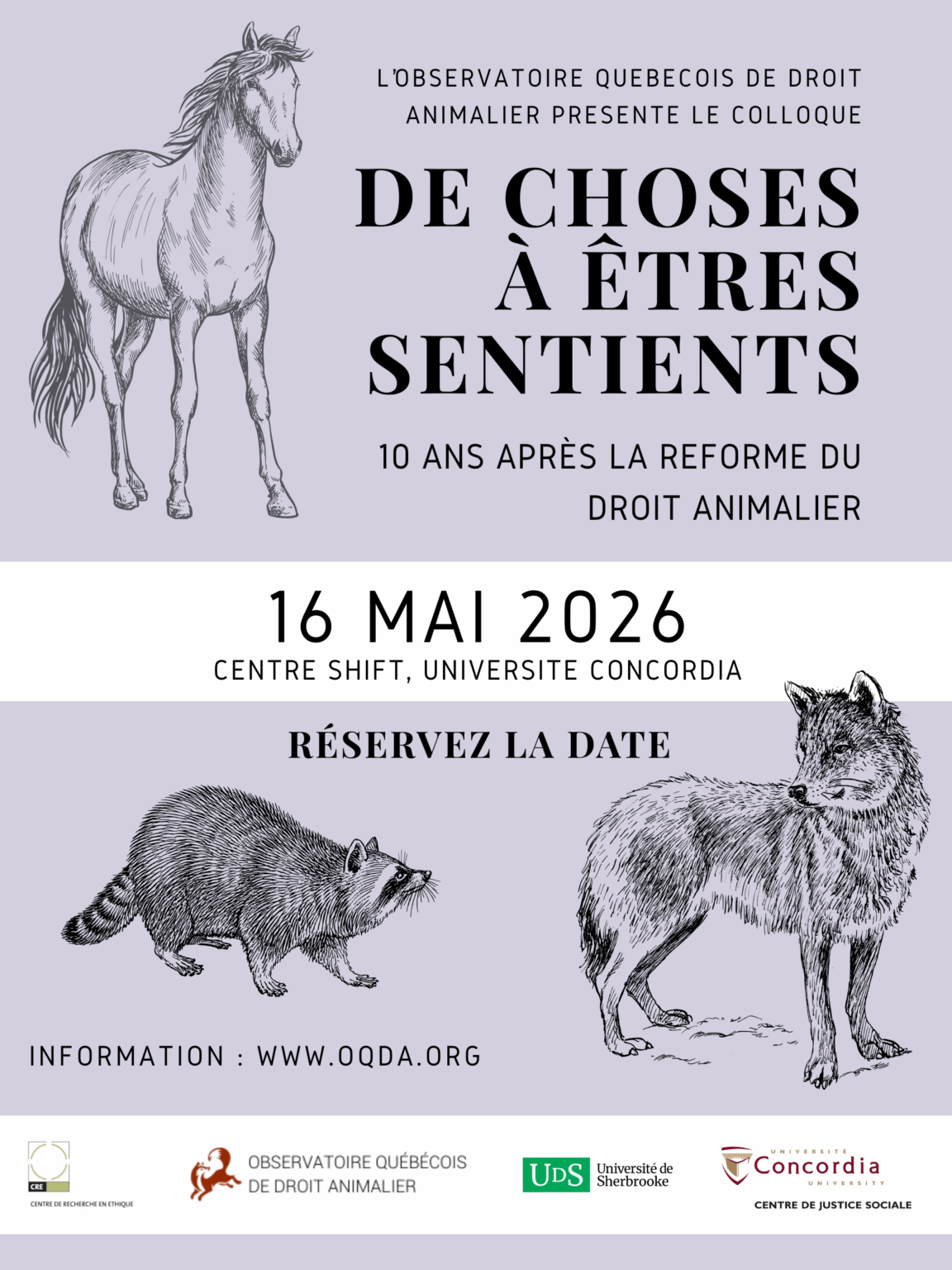 Le vendredi 15 mai 2026 aura lieu un atelier de recherches sur les animaux (sur invitation) pour offrir un espace de réflexion et de discussion autour de recherches en chantier. L’Atelier vise les recherches touchant les animaux, que ce soit en droit, philosophie, histoire, sociologie, anthropologie, science politique, études culturelles, littérature, ou autres disciplines connexes.